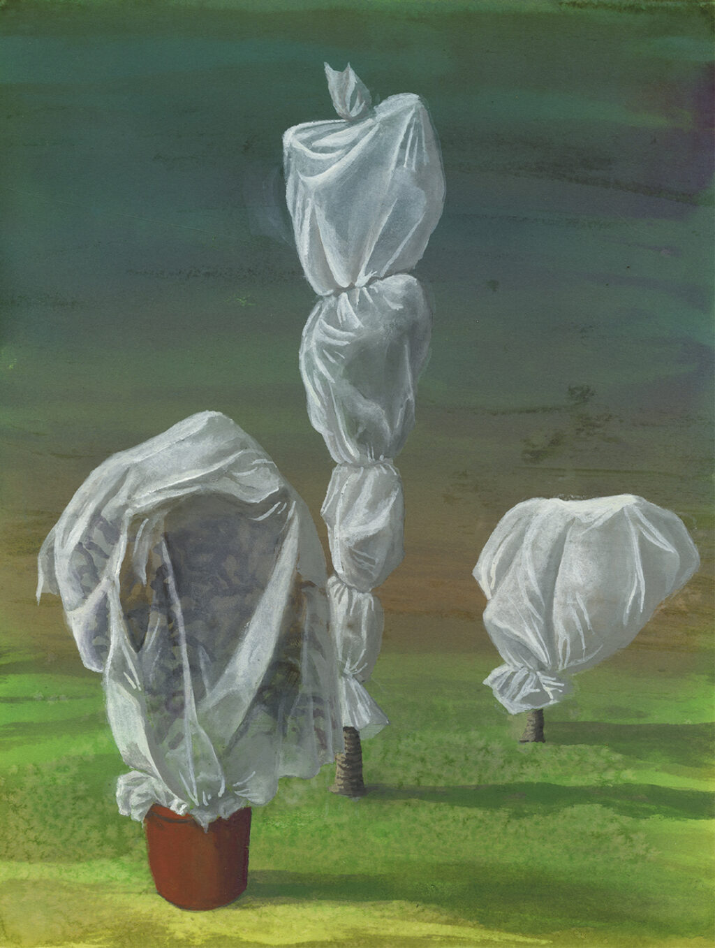 Collisions surréalistes (un dentier sur une plaine, ce qui reste d’un feu de cheminée sur un lit, un visage dessiné sur un arbre abattu), porosité hypnotique de la nature et de l’être, apparitions de chevaux chtoniens, fragments d’emprunts à L’Empire des lumières de Magritte, stratification d’images d’où naît la mélancolie, voies doubles, multiples et désertées ou chemins qui ne mènent nulle part… Les paysages extérieurs de Maïté Grandjouan renseignent en fait sur la forme et sur l’humeur des nuages intérieurs de ses personnages, qu’ils soient visibles ou invisibles. Chaque toile de Tout ce que je ne t’ai jamais dit (à paraître aux éditions Frémok) est une nouvelle variation sur l’absence et la permanence. Il y a toujours un souffle derrière l’image, un drame ou une comédie dormant derrière les objets du quotidien, un souvenir derrière un mot, un trouble infusant un décor.